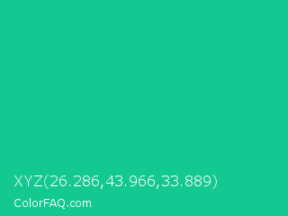 XYZ 26.286,43.966,33.889 Color is a normal green color and the nearest color is Caribbean Green #00cc99. Hex code #14c991 and RGB value is rgb(20,201,145). In RGB color space, this color is composed of 8% red, 79% green, 57% blue, In CMYK color space, this color is composed of 90% cyan, 0% magenta, 28% yellow , 21% black , In HSL color space, this color has a hue angle of 161° , 82% saturation and 43% lightness.