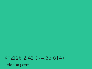 XYZ 26.2,42.174,35.614 Color is a normal green color and the nearest color is Shamrock #33cc99. Hex code #2ac496 and RGB value is rgb(42,196,150). In RGB color space, this color is composed of 16% red, 77% green, 59% blue, In CMYK color space, this color is composed of 79% cyan, 0% magenta, 23% yellow , 23% black , In HSL color space, this color has a hue angle of 162° , 65% saturation and 47% lightness.