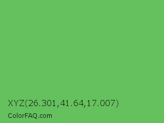 XYZ 26.301,41.64,17.007 Color is a normal green color and the nearest color is Mantis #74c365. Hex code #64c15d and RGB value is rgb(100,193,93). In RGB color space, this color is composed of 39% red, 76% green, 36% blue, In CMYK color space, this color is composed of 48% cyan, 0% magenta, 52% yellow , 24% black , In HSL color space, this color has a hue angle of 116° , 45% saturation and 56% lightness.