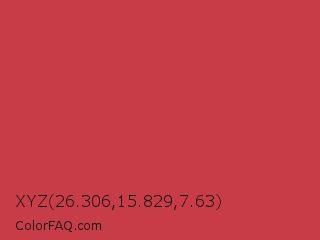 XYZ 26.306,15.829,7.63 Color is a normal red color and the nearest color is English Vermillion #cc474b. Hex code #c73c47 and RGB value is rgb(199,60,71). In RGB color space, this color is composed of 78% red, 24% green, 28% blue, In CMYK color space, this color is composed of 0% cyan, 70% magenta, 64% yellow , 22% black , In HSL color space, this color has a hue angle of 355° , 55% saturation and 51% lightness.
