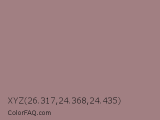 XYZ 26.317,24.368,24.435 Color is a normal red color and the nearest color is Pharlap #a3807b. Hex code #a17f82 and RGB value is rgb(161,127,130). In RGB color space, this color is composed of 63% red, 50% green, 51% blue, In CMYK color space, this color is composed of 0% cyan, 21% magenta, 19% yellow , 37% black , In HSL color space, this color has a hue angle of 355° , 15% saturation and 56% lightness.