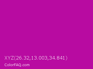 XYZ 26.32,13.003,34.841 Color is a normal magenta color and the nearest color is Heliotrope Magenta #aa00bb. Hex code #b80ba1 and RGB value is rgb(184,11,161). In RGB color space, this color is composed of 72% red, 4% green, 63% blue, In CMYK color space, this color is composed of 0% cyan, 94% magenta, 13% yellow , 28% black , In HSL color space, this color has a hue angle of 308° , 89% saturation and 38% lightness.