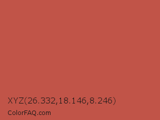 XYZ 26.332,18.146,8.246 Color is a normal red color and the nearest color is Deep Chestnut #b94e48. Hex code #c15448 and RGB value is rgb(193,84,72). In RGB color space, this color is composed of 76% red, 33% green, 28% blue, In CMYK color space, this color is composed of 0% cyan, 56% magenta, 63% yellow , 24% black , In HSL color space, this color has a hue angle of 6° , 49% saturation and 52% lightness.