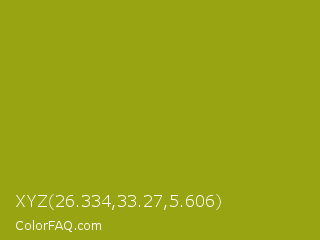 XYZ 26.334,33.27,5.606 Color is a normal yellow color and the nearest color is Citron #9fa91f. Hex code #98a412 and RGB value is rgb(152,164,18). In RGB color space, this color is composed of 60% red, 64% green, 7% blue, In CMYK color space, this color is composed of 7% cyan, 0% magenta, 89% yellow , 36% black , In HSL color space, this color has a hue angle of 65° , 80% saturation and 36% lightness.