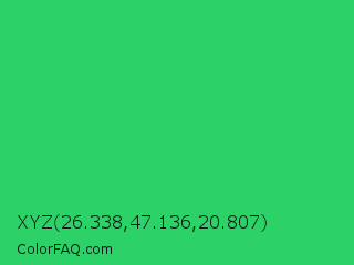 XYZ 26.338,47.136,20.807 Color is a normal green color and the nearest color is UFO Green #3cd070. Hex code #2cd168 and RGB value is rgb(44,209,104). In RGB color space, this color is composed of 17% red, 82% green, 41% blue, In CMYK color space, this color is composed of 79% cyan, 0% magenta, 50% yellow , 18% black , In HSL color space, this color has a hue angle of 142° , 65% saturation and 50% lightness.