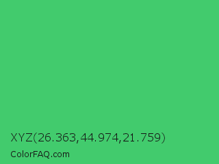 XYZ 26.363,44.974,21.759 Color is a normal green color and the nearest color is UFO Green #3cd070. Hex code #42cb6d and RGB value is rgb(66,203,109). In RGB color space, this color is composed of 26% red, 80% green, 43% blue, In CMYK color space, this color is composed of 67% cyan, 0% magenta, 46% yellow , 20% black , In HSL color space, this color has a hue angle of 139° , 57% saturation and 53% lightness.