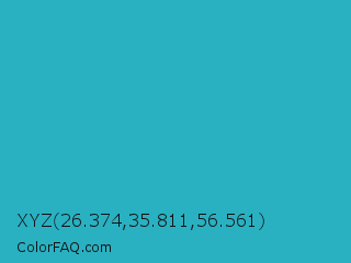 XYZ 26.374,35.811,56.561 Color is a normal cyan color and the nearest color is Ball Blue #21abcd. Hex code #29b1c2 and RGB value is rgb(41,177,194). In RGB color space, this color is composed of 16% red, 69% green, 76% blue, In CMYK color space, this color is composed of 79% cyan, 9% magenta, 0% yellow , 24% black , In HSL color space, this color has a hue angle of 187° , 65% saturation and 46% lightness.