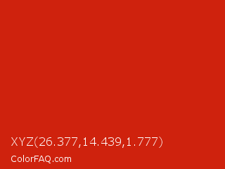 XYZ 26.377,14.439,1.777 Color is a normal red color and the nearest color is Thunderbird #c02b18. Hex code #cf220d and RGB value is rgb(207,34,13). In RGB color space, this color is composed of 81% red, 13% green, 5% blue, In CMYK color space, this color is composed of 0% cyan, 84% magenta, 94% yellow , 19% black , In HSL color space, this color has a hue angle of 6° , 88% saturation and 43% lightness.