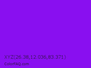 XYZ 26.38,12.036,83.371 Color is a normal purple color and the nearest color is Electric Violet #8b00ff. Hex code #8a0ff0 and RGB value is rgb(138,15,240). In RGB color space, this color is composed of 54% red, 6% green, 94% blue, In CMYK color space, this color is composed of 43% cyan, 94% magenta, 0% yellow , 6% black , In HSL color space, this color has a hue angle of 273° , 88% saturation and 50% lightness.