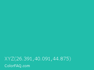 XYZ 26.391,40.091,44.875 Color is a normal cyan color and the nearest color is Light Sea Green #20b2aa. Hex code #21beab and RGB value is rgb(33,190,171). In RGB color space, this color is composed of 13% red, 75% green, 67% blue, In CMYK color space, this color is composed of 83% cyan, 0% magenta, 10% yellow , 25% black , In HSL color space, this color has a hue angle of 173° , 70% saturation and 44% lightness.