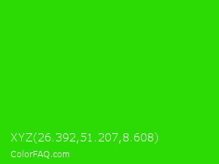 XYZ 26.392,51.207,8.608 Color is a normal green color and the nearest color is Harlequin Green #46cb18. Hex code #2cdb04 and RGB value is rgb(44,219,4). In RGB color space, this color is composed of 17% red, 86% green, 2% blue, In CMYK color space, this color is composed of 80% cyan, 0% magenta, 98% yellow , 14% black , In HSL color space, this color has a hue angle of 109° , 96% saturation and 44% lightness.