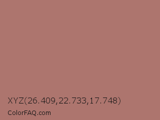 XYZ 26.409,22.733,17.748 Color is a normal red color and the nearest color is Copper Penny #ad6f69. Hex code #ad756e and RGB value is rgb(173,117,110). In RGB color space, this color is composed of 68% red, 46% green, 43% blue, In CMYK color space, this color is composed of 0% cyan, 32% magenta, 36% yellow , 32% black , In HSL color space, this color has a hue angle of 7° , 28% saturation and 55% lightness.