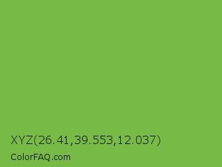 XYZ 26.41,39.553,12.037 Color is a normal green color and the nearest color is Sushi #87ab39. Hex code #78ba46 and RGB value is rgb(120,186,70). In RGB color space, this color is composed of 47% red, 73% green, 27% blue, In CMYK color space, this color is composed of 35% cyan, 0% magenta, 62% yellow , 27% black , In HSL color space, this color has a hue angle of 94° , 46% saturation and 50% lightness.