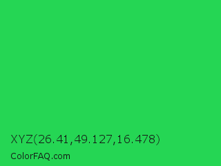 XYZ 26.41,49.127,16.478 Color is a normal green color and the nearest color is Malachite #0bda51. Hex code #25d654 and RGB value is rgb(37,214,84). In RGB color space, this color is composed of 15% red, 84% green, 33% blue, In CMYK color space, this color is composed of 83% cyan, 0% magenta, 61% yellow , 16% black , In HSL color space, this color has a hue angle of 136° , 71% saturation and 49% lightness.