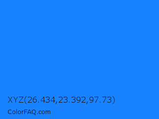 XYZ 26.434,23.392,97.73 Color is a normal blue color and the nearest color is Blue Crayola #1f75fe. Hex code #1982ff and RGB value is rgb(25,130,255). In RGB color space, this color is composed of 10% red, 51% green, 100% blue, In CMYK color space, this color is composed of 90% cyan, 49% magenta, 0% yellow , 0% black , In HSL color space, this color has a hue angle of 213° , 100% saturation and 55% lightness.
