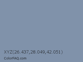 XYZ 26.437,28.049,42.051 Color is a normal blue color and the nearest color is Weldon Blue #7c98ab. Hex code #8092aa and RGB value is rgb(128,146,170). In RGB color space, this color is composed of 50% red, 57% green, 67% blue, In CMYK color space, this color is composed of 25% cyan, 14% magenta, 0% yellow , 33% black , In HSL color space, this color has a hue angle of 214° , 20% saturation and 58% lightness.
