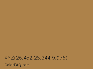 XYZ 26.452,25.344,9.976 Color is a normal orange color and the nearest color is Driftwood #af8751. Hex code #ad824a and RGB value is rgb(173,130,74). In RGB color space, this color is composed of 68% red, 51% green, 29% blue, In CMYK color space, this color is composed of 0% cyan, 25% magenta, 57% yellow , 32% black , In HSL color space, this color has a hue angle of 34° , 40% saturation and 48% lightness.