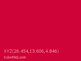 XYZ 26.454,13.606,4.846 Color is a normal red color and the nearest color is Vivid Crimson #cc0033. Hex code #cf0337 and RGB value is rgb(207,3,55). In RGB color space, this color is composed of 81% red, 1% green, 22% blue, In CMYK color space, this color is composed of 0% cyan, 99% magenta, 73% yellow , 19% black , In HSL color space, this color has a hue angle of 345° , 97% saturation and 41% lightness.