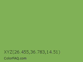 XYZ 26.455,36.783,14.51 Color is a normal green color and the nearest color is Chelsea Cucumber #83aa5d. Hex code #81b156 and RGB value is rgb(129,177,86). In RGB color space, this color is composed of 51% red, 69% green, 34% blue, In CMYK color space, this color is composed of 27% cyan, 0% magenta, 51% yellow , 31% black , In HSL color space, this color has a hue angle of 92° , 37% saturation and 52% lightness.