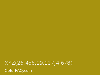 XYZ 26.456,29.117,4.678 Color is a normal yellow color and the nearest color is Dark Yellow #9b870c. Hex code #a7930f and RGB value is rgb(167,147,15). In RGB color space, this color is composed of 65% red, 58% green, 6% blue, In CMYK color space, this color is composed of 0% cyan, 12% magenta, 91% yellow , 35% black , In HSL color space, this color has a hue angle of 52° , 84% saturation and 36% lightness.