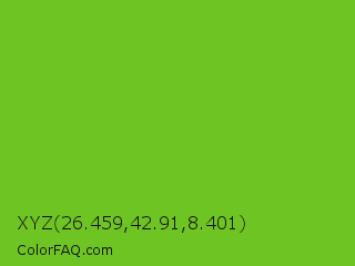 XYZ 26.459,42.91,8.401 Color is a normal green color and the nearest color is Lima #76bd17. Hex code #6ec422 and RGB value is rgb(110,196,34). In RGB color space, this color is composed of 43% red, 77% green, 13% blue, In CMYK color space, this color is composed of 44% cyan, 0% magenta, 83% yellow , 23% black , In HSL color space, this color has a hue angle of 92° , 70% saturation and 45% lightness.