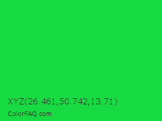 XYZ 26.461,50.742,13.71 Color is a normal green color and the nearest color is Malachite #0bda51. Hex code #18da43 and RGB value is rgb(24,218,67). In RGB color space, this color is composed of 9% red, 85% green, 26% blue, In CMYK color space, this color is composed of 89% cyan, 0% magenta, 69% yellow , 15% black , In HSL color space, this color has a hue angle of 133° , 80% saturation and 47% lightness.