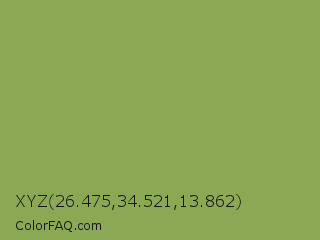 XYZ 26.475,34.521,13.862 Color is a normal green color and the nearest color is Chelsea Cucumber #83aa5d. Hex code #8ba955 and RGB value is rgb(139,169,85). In RGB color space, this color is composed of 55% red, 66% green, 33% blue, In CMYK color space, this color is composed of 18% cyan, 0% magenta, 50% yellow , 34% black , In HSL color space, this color has a hue angle of 81° , 33% saturation and 50% lightness.