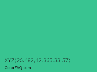 XYZ 26.482,42.365,33.57 Color is a normal green color and the nearest color is Shamrock #33cc99. Hex code #38c491 and RGB value is rgb(56,196,145). In RGB color space, this color is composed of 22% red, 77% green, 57% blue, In CMYK color space, this color is composed of 71% cyan, 0% magenta, 26% yellow , 23% black , In HSL color space, this color has a hue angle of 158° , 56% saturation and 49% lightness.