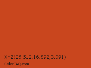 XYZ 26.512,16.892,3.091 Color is a normal red color and the nearest color is Dark Pastel Red #c23b22. Hex code #c9461e and RGB value is rgb(201,70,30). In RGB color space, this color is composed of 79% red, 27% green, 12% blue, In CMYK color space, this color is composed of 0% cyan, 65% magenta, 85% yellow , 21% black , In HSL color space, this color has a hue angle of 14° , 74% saturation and 45% lightness.