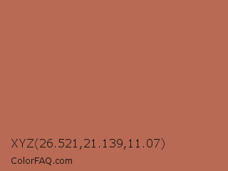 XYZ 26.521,21.139,11.07 Color is a normal red color and the nearest color is Santa Fe #b16d52. Hex code #b86a54 and RGB value is rgb(184,106,84). In RGB color space, this color is composed of 72% red, 42% green, 33% blue, In CMYK color space, this color is composed of 0% cyan, 42% magenta, 54% yellow , 28% black , In HSL color space, this color has a hue angle of 13° , 41% saturation and 53% lightness.