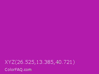 XYZ 26.525,13.385,40.721 Color is a normal magenta color and the nearest color is Byzantine #bd33a4. Hex code #b31bad and RGB value is rgb(179,27,173). In RGB color space, this color is composed of 70% red, 11% green, 68% blue, In CMYK color space, this color is composed of 0% cyan, 85% magenta, 3% yellow , 30% black , In HSL color space, this color has a hue angle of 302° , 74% saturation and 40% lightness.