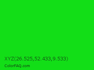 XYZ 26.525,52.433,9.533 Color is a normal green color and the nearest color is Vivid Malachite #00cc33. Hex code #12de17 and RGB value is rgb(18,222,23). In RGB color space, this color is composed of 7% red, 87% green, 9% blue, In CMYK color space, this color is composed of 92% cyan, 0% magenta, 90% yellow , 13% black , In HSL color space, this color has a hue angle of 121° , 85% saturation and 47% lightness.
