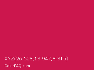 XYZ 26.528,13.947,8.315 Color is a normal rose color and the nearest color is Pictorial Carmine #c30b4e. Hex code #cc164d and RGB value is rgb(204,22,77). In RGB color space, this color is composed of 80% red, 9% green, 30% blue, In CMYK color space, this color is composed of 0% cyan, 89% magenta, 62% yellow , 20% black , In HSL color space, this color has a hue angle of 342° , 81% saturation and 44% lightness.