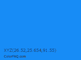 XYZ 26.52,25.654,91.55 Color is a normal blue color and the nearest color is Dodger Blue #1e90ff. Hex code #178cf7 and RGB value is rgb(23,140,247). In RGB color space, this color is composed of 9% red, 55% green, 97% blue, In CMYK color space, this color is composed of 91% cyan, 43% magenta, 0% yellow , 3% black , In HSL color space, this color has a hue angle of 209° , 93% saturation and 53% lightness.