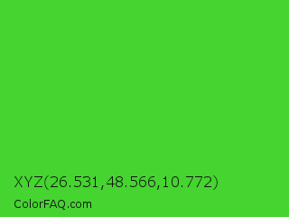 XYZ 26.531,48.566,10.772 Color is a normal green color and the nearest color is Lime Green #32cd32. Hex code #45d430 and RGB value is rgb(69,212,48). In RGB color space, this color is composed of 27% red, 83% green, 19% blue, In CMYK color space, this color is composed of 67% cyan, 0% magenta, 77% yellow , 17% black , In HSL color space, this color has a hue angle of 112° , 66% saturation and 51% lightness.