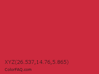 XYZ 26.537,14.76,5.865 Color is a normal red color and the nearest color is Brick Red #c62d42. Hex code #cc293d and RGB value is rgb(204,41,61). In RGB color space, this color is composed of 80% red, 16% green, 24% blue, In CMYK color space, this color is composed of 0% cyan, 80% magenta, 70% yellow , 20% black , In HSL color space, this color has a hue angle of 353° , 67% saturation and 48% lightness.