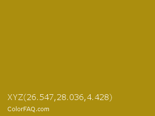 XYZ 26.547,28.036,4.428 Color is a normal yellow color and the nearest color is Dark Goldenrod #b8860b. Hex code #ab8e0e and RGB value is rgb(171,142,14). In RGB color space, this color is composed of 67% red, 56% green, 5% blue, In CMYK color space, this color is composed of 0% cyan, 17% magenta, 92% yellow , 33% black , In HSL color space, this color has a hue angle of 49° , 85% saturation and 36% lightness.