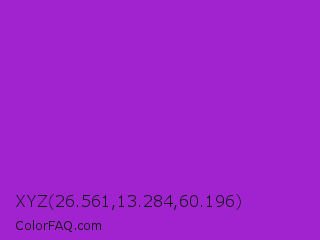 XYZ 26.561,13.284,60.196 Color is a normal purple color and the nearest color is Dark Orchid #9932cc. Hex code #a123cf and RGB value is rgb(161,35,207). In RGB color space, this color is composed of 63% red, 14% green, 81% blue, In CMYK color space, this color is composed of 22% cyan, 83% magenta, 0% yellow , 19% black , In HSL color space, this color has a hue angle of 284° , 71% saturation and 47% lightness.