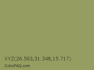 XYZ 26.563,31.348,15.717 Color is a normal yellow color and the nearest color is Moss Green #8a9a5b. Hex code #959d60 and RGB value is rgb(149,157,96). In RGB color space, this color is composed of 58% red, 62% green, 38% blue, In CMYK color space, this color is composed of 5% cyan, 0% magenta, 39% yellow , 38% black , In HSL color space, this color has a hue angle of 68° , 24% saturation and 50% lightness.
