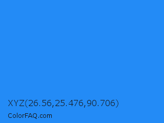 XYZ 26.56,25.476,90.706 Color is a normal blue color and the nearest color is Dodger Blue #1e90ff. Hex code #238bf6 and RGB value is rgb(35,139,246). In RGB color space, this color is composed of 14% red, 55% green, 96% blue, In CMYK color space, this color is composed of 86% cyan, 43% magenta, 0% yellow , 4% black , In HSL color space, this color has a hue angle of 210° , 92% saturation and 55% lightness.