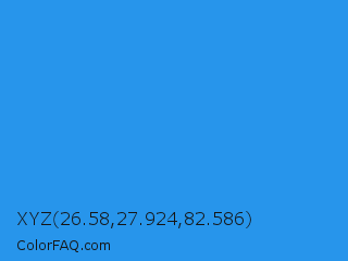 XYZ 26.58,27.924,82.586 Color is a normal blue color and the nearest color is Button Blue #24a0ed. Hex code #2795eb and RGB value is rgb(39,149,235). In RGB color space, this color is composed of 15% red, 58% green, 92% blue, In CMYK color space, this color is composed of 83% cyan, 37% magenta, 0% yellow , 8% black , In HSL color space, this color has a hue angle of 206° , 83% saturation and 54% lightness.