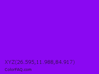 XYZ 26.595,11.988,84.917 Color is a normal purple color and the nearest color is Electric Violet #8b00ff. Hex code #8a08f2 and RGB value is rgb(138,8,242). In RGB color space, this color is composed of 54% red, 3% green, 95% blue, In CMYK color space, this color is composed of 43% cyan, 97% magenta, 0% yellow , 5% black , In HSL color space, this color has a hue angle of 273° , 94% saturation and 49% lightness.