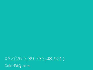 XYZ 26.5,39.735,48.921 Color is a normal cyan color and the nearest color is Tiffany Blue #0abab5. Hex code #0dbdb3 and RGB value is rgb(13,189,179). In RGB color space, this color is composed of 5% red, 74% green, 70% blue, In CMYK color space, this color is composed of 93% cyan, 0% magenta, 5% yellow , 26% black , In HSL color space, this color has a hue angle of 177° , 87% saturation and 40% lightness.