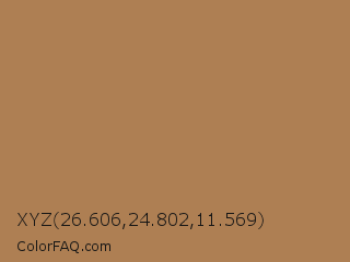 XYZ 26.606,24.802,11.569 Color is a normal orange color and the nearest color is Driftwood #af8751. Hex code #ae7f53 and RGB value is rgb(174,127,83). In RGB color space, this color is composed of 68% red, 50% green, 33% blue, In CMYK color space, this color is composed of 0% cyan, 27% magenta, 52% yellow , 32% black , In HSL color space, this color has a hue angle of 29° , 36% saturation and 50% lightness.