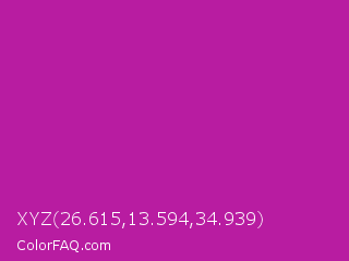 XYZ 26.615,13.594,34.939 Color is a normal magenta color and the nearest color is Byzantine #bd33a4. Hex code #b81ca1 and RGB value is rgb(184,28,161). In RGB color space, this color is composed of 72% red, 11% green, 63% blue, In CMYK color space, this color is composed of 0% cyan, 85% magenta, 13% yellow , 28% black , In HSL color space, this color has a hue angle of 309° , 74% saturation and 42% lightness.