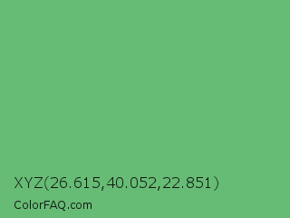 XYZ 26.615,40.052,22.851 Color is a normal green color and the nearest color is Fern #63b76c. Hex code #66bc74 and RGB value is rgb(102,188,116). In RGB color space, this color is composed of 40% red, 74% green, 45% blue, In CMYK color space, this color is composed of 46% cyan, 0% magenta, 38% yellow , 26% black , In HSL color space, this color has a hue angle of 130° , 39% saturation and 57% lightness.