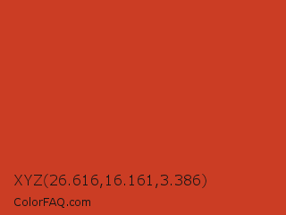XYZ 26.616,16.161,3.386 Color is a normal red color and the nearest color is Dark Pastel Red #c23b22. Hex code #cb3d24 and RGB value is rgb(203,61,36). In RGB color space, this color is composed of 80% red, 24% green, 14% blue, In CMYK color space, this color is composed of 0% cyan, 70% magenta, 82% yellow , 20% black , In HSL color space, this color has a hue angle of 9° , 70% saturation and 47% lightness.
