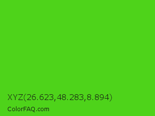 XYZ 26.623,48.283,8.894 Color is a normal green color and the nearest color is Harlequin Green #46cb18. Hex code #4ed31a and RGB value is rgb(78,211,26). In RGB color space, this color is composed of 31% red, 83% green, 10% blue, In CMYK color space, this color is composed of 63% cyan, 0% magenta, 88% yellow , 17% black , In HSL color space, this color has a hue angle of 103° , 78% saturation and 46% lightness.