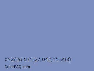 XYZ 26.635,27.042,51.393 Color is a light blue color and the nearest color is Ship Cove #788bba. Hex code #798ebc and RGB value is rgb(121,142,188). In RGB color space, this color is composed of 47% red, 56% green, 74% blue, In CMYK color space, this color is composed of 36% cyan, 24% magenta, 0% yellow , 26% black , In HSL color space, this color has a hue angle of 221° , 33% saturation and 61% lightness.