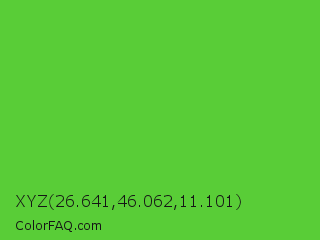 XYZ 26.641,46.062,11.101 Color is a normal green color and the nearest color is Green RYB #66b032. Hex code #59cd37 and RGB value is rgb(89,205,55). In RGB color space, this color is composed of 35% red, 80% green, 22% blue, In CMYK color space, this color is composed of 57% cyan, 0% magenta, 73% yellow , 20% black , In HSL color space, this color has a hue angle of 106° , 60% saturation and 51% lightness.